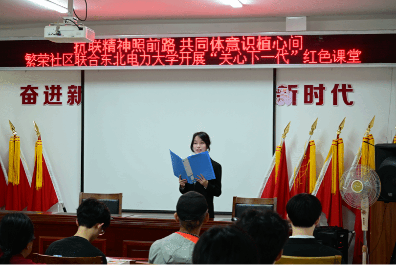 学生党员在学生第二党支部书记李丹的带领下,走进船营区繁荣社区,联合社区开展了一场主题鲜明、内容丰富的党课宣讲活动。活动围绕“铸牢中华民族共同体意识”和“弘扬东北抗联精神”两大主题,分为观影学习和主题分享两个环节。