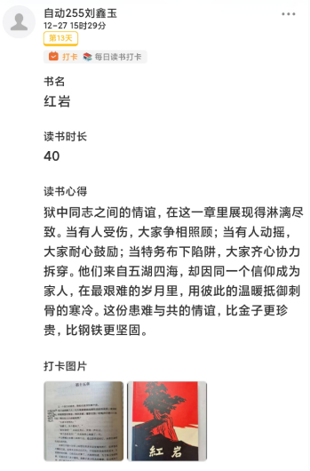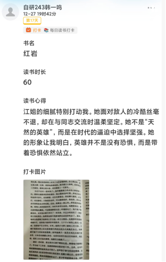 400余名学子加入红色读书打卡圈子,坚持每日研读红色经典、分享感悟心得。同学们在交流中碰撞思想、相互启发,让尘封的历史故事焕发现代意义,让坚定的理想信念扎根心底,以书香筑牢信仰之基。