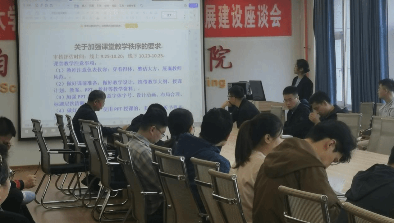 线上评估工作方案,强调了课堂教学的要求,针对学校下发的《本科教育教学审核评估应知应会(教师版)》进行学习。线上评估工作方案明确了工作分组、职责和工作要求,工作责任细化落实到了个人;从仪表仪态、课前准备、板书设计、PPT质量、课堂教学质量、课堂管理等六个方面对课堂教学提出了要求;从学校历史沿革、国家政策类、校情类、新一轮审核评估类等方面解读了学校下发的应知应会。