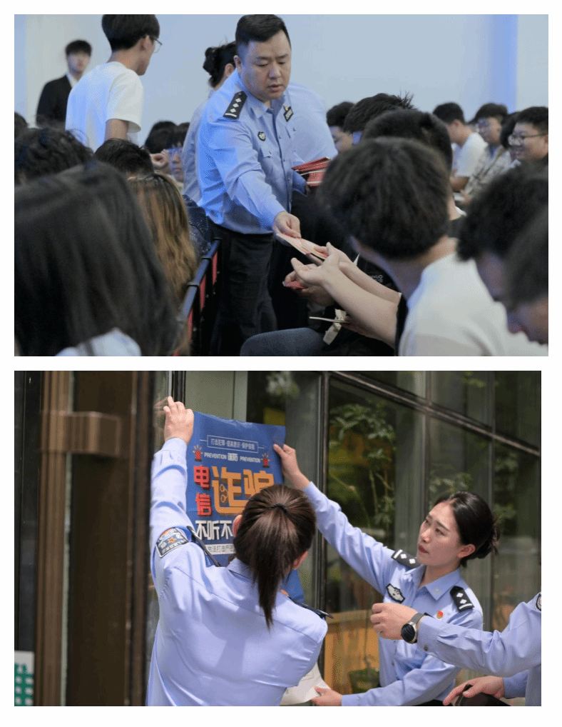 专题讲座后,警官们通过张贴主题海报、发送法治传单等方式进一步宣传法治教育内容,系统传导“三不一多”防范准则,加深同学们对网络刷单、冒充公检法等典型诈骗手法的理解,实现法治教育全覆盖,有效提升师生法治素养与风险抵御能力,夯实校园安全防线。