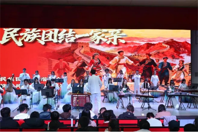 同心筑梦,族韵相融。经过两个月的紧张筹备,最终共有《吉临傣韵》《弦伴疆舞》《壮韵舞春漪》等 7 个节目进入了展演环节,其中由吉林市群众艺术馆与校民乐团合奏的《霍元甲》《飞驰天路》展现了中华民族自强不息、不畏强暴的民族气节和爱国精神。吉林市京剧传承保护中心李松瞳老师带来的《天女散花》京剧表演展现了中华民族崇善扬正的价值追求与兼容并蓄、博大精深的文化气度。展演现场气氛热烈,通过舞蹈、歌唱、器乐等多种艺术形式,以 “弦歌启章・九州同辉”“山河绘卷・地域之声”“文脉传承・民族之魂” 三个篇章全方位、多层次地展现了各民族独特的风采之美,生动呈现出一幅各民族多元一体,和而不同,交融共生,繁荣发展的绮丽画卷。